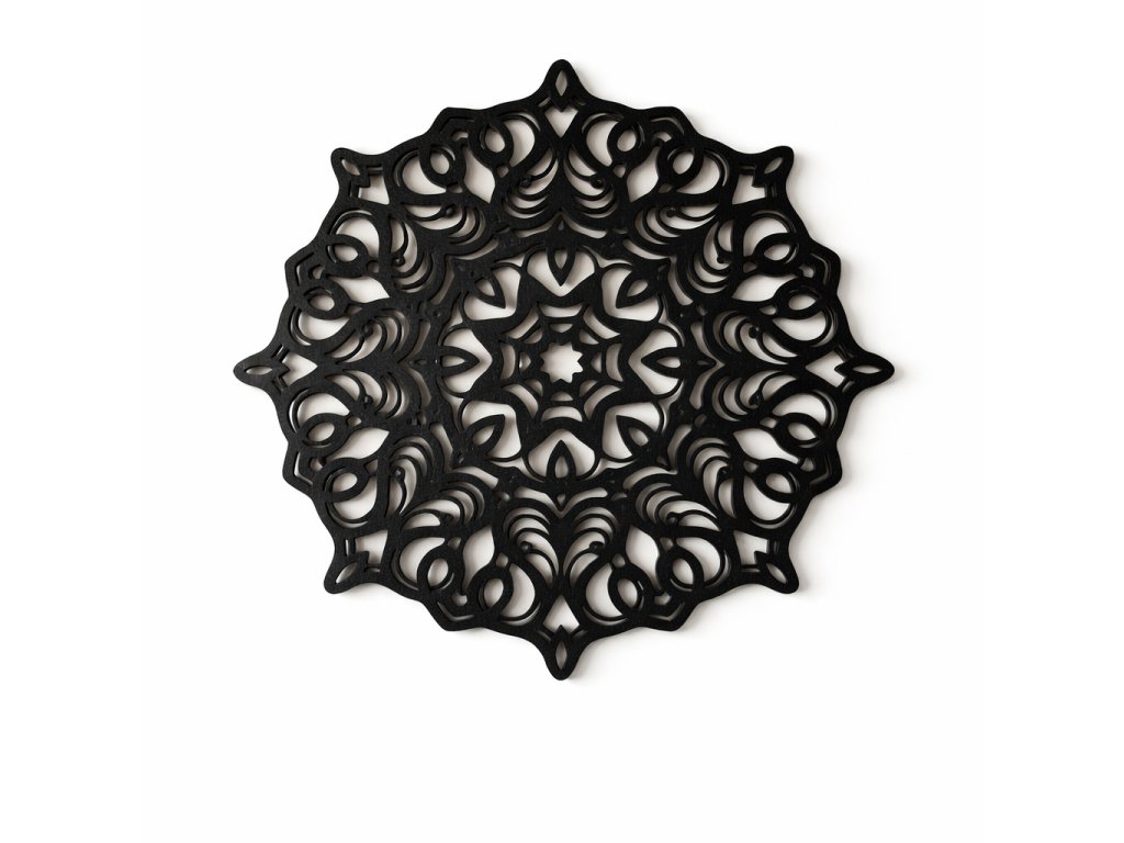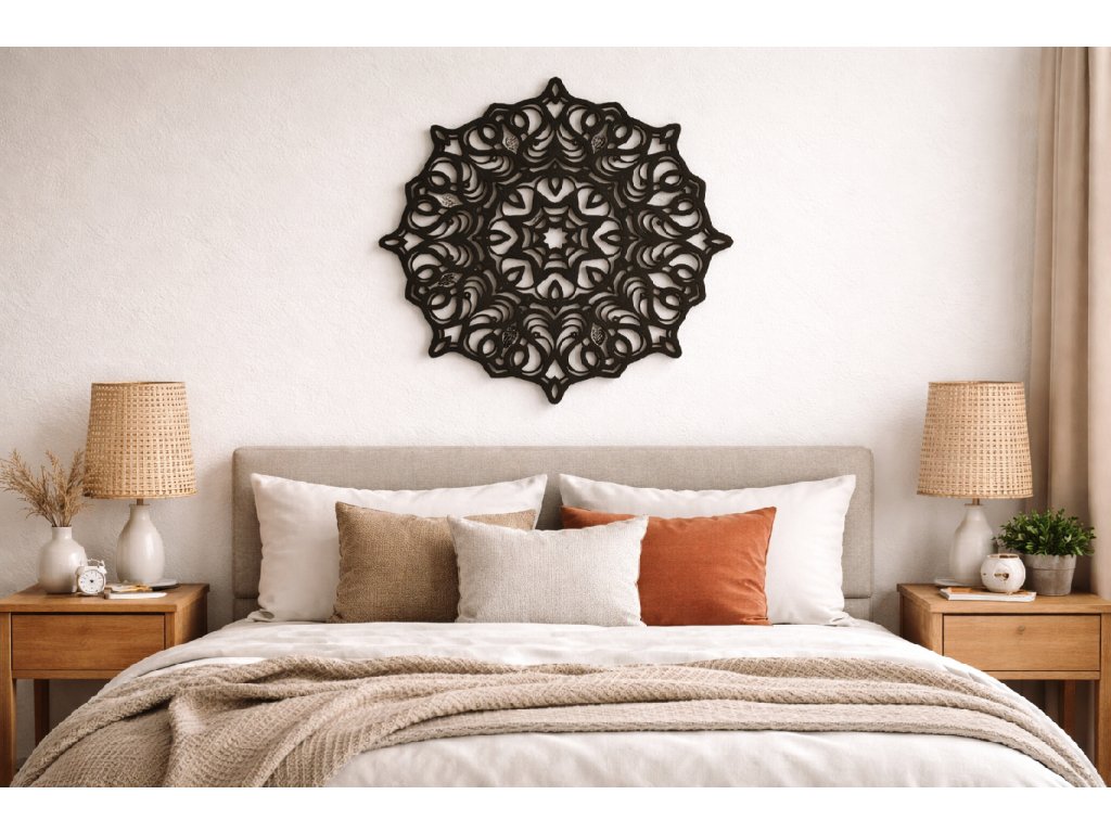 Mandala je geometrický obrazec, který je tradičně spojován s jednotou, harmonií a rovnováhou. Její harmonický kruhový tvar působí uklidňujícím dojmem a pomáhá vytvořit příjemnou atmosféru v každém prostoru.