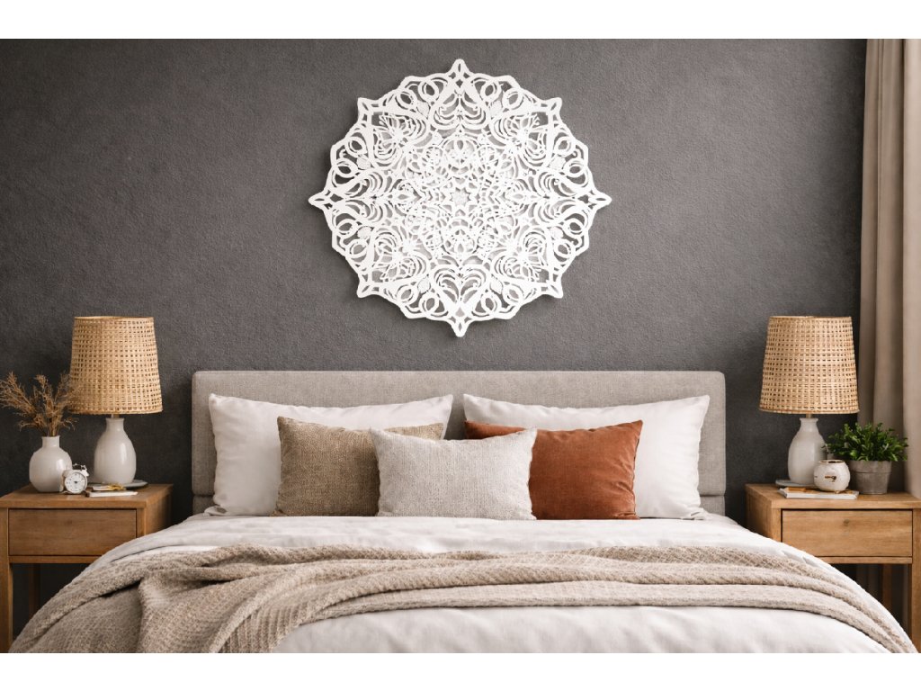 Mandala na zeď je krásná dřevěná dekorace, která vnese do vašeho interiéru klid, harmonii a jedinečný vizuální prvek. Precizně vyřezaný geometrický motiv působí esteticky a elegantně, takže ozdobí jak moderní, tak i přírodní styl bydlení.