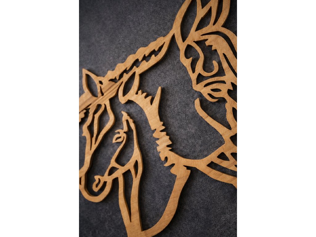 Vyřezávaný dřevěný obraz – Kobyla a hříbě | dekorace ze dřeva