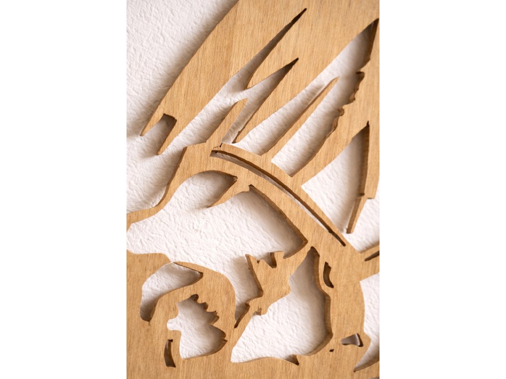 Tento vyřezávaný obraz je vyroben z kvalitního dřeva s důrazem na detail a čisté linie. Díky preciznímu vyřezání vzniká působivý motiv, který krásně vynikne na zdi i jako samostatná dekorace na poličce.